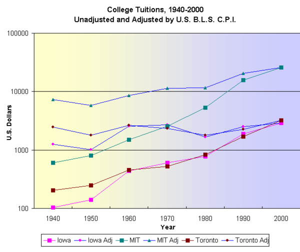 Tuition at the University of Toronto tracked close to inflation rates during the entire period. The University of Iowa had rapid increases in tuition during the 1950s and then tracked close to inflation rates since that time. The Massachusetts Institute of Technology (MIT), among the most expensive of the private U.S. educational institutions throughout the 20th century, had continual large tuition increases, dipping slightly below inflation rates only during the World War II years.